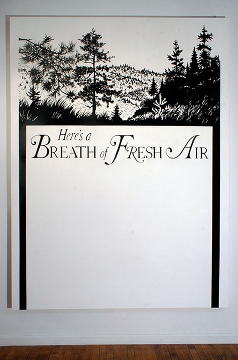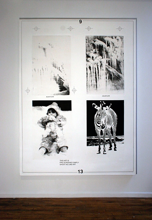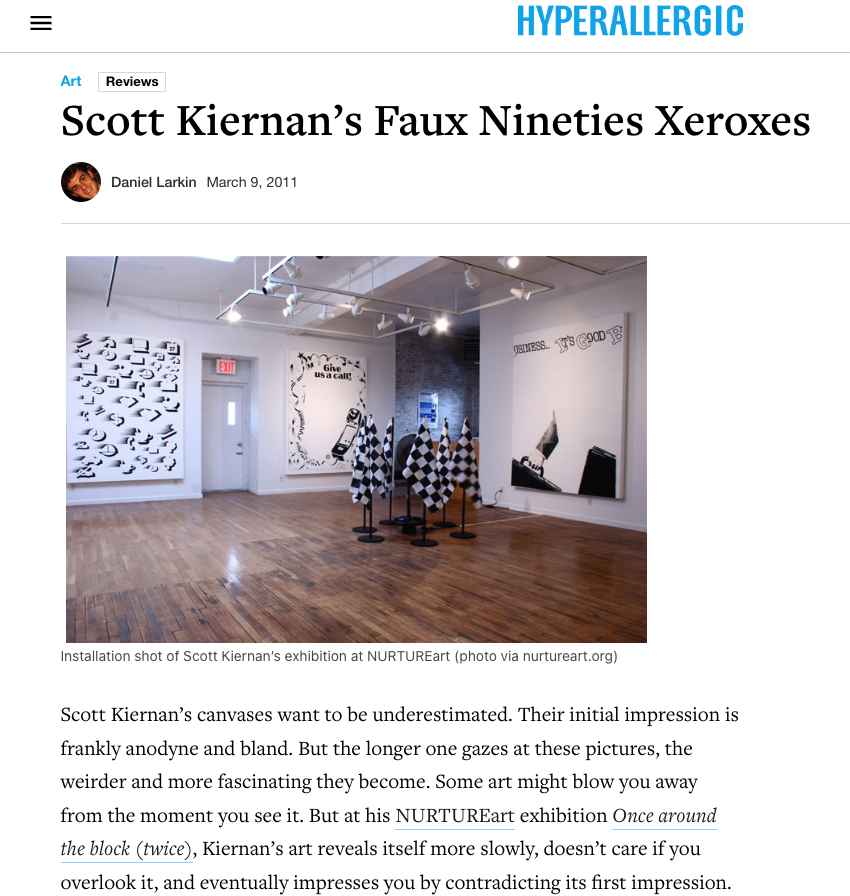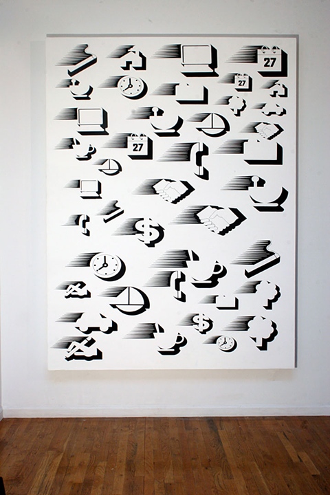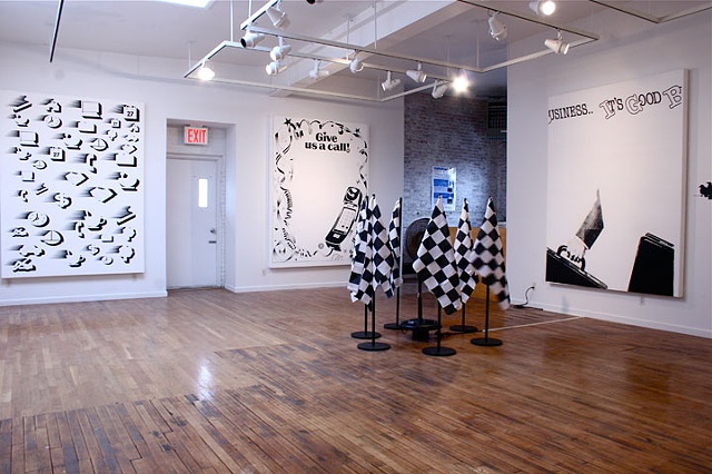 Once Around the Block (twice) excavates a particular familiarity of the recent past, using visuals from “royalty-free” clip art of the early 1990’s. The images are shifted in scale and lack the necessary content that would eventually render them complete advertisements, resulting in a series of starkly contrasted, visually arresting paintings and kinetic sculpture in black and white. In his use of these “interchangeable,” stock motifs, Kiernan brings into question the strive for individuality of our current economic climate by posing a recognizable perspective from a not too distant past.”