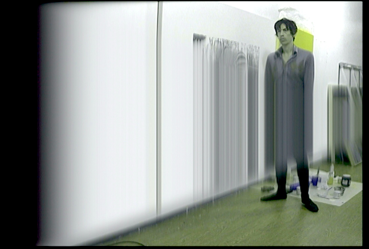 Six 6 x 8 ft. paintings: flashe and ink on canvas, six checkered flags, oscillating fan, powered turntable